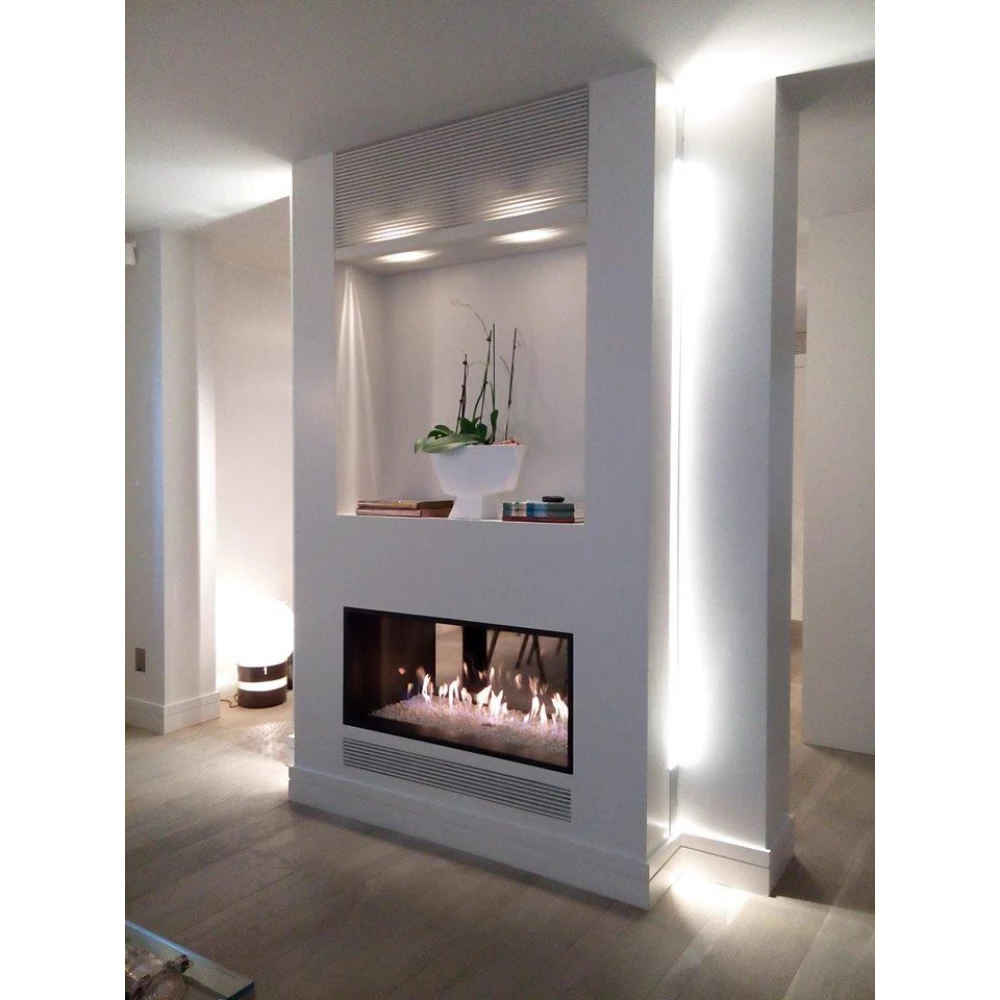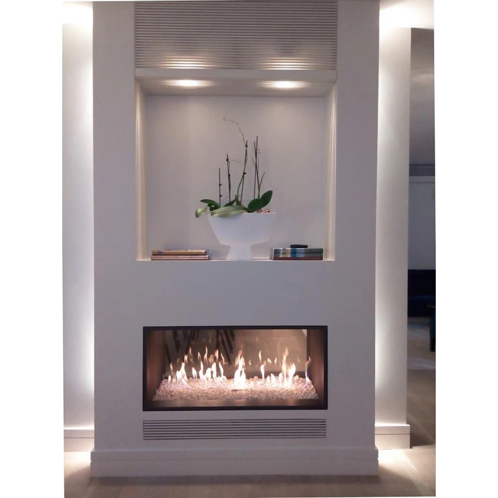 Сквозная топка с горизонтальными окнами из стекла с двух противоположных сторон. Корпус изготовлен из стали толщиной 3,5 мм. Топка работает от природного газа бутан или баллонного газа пропан, что позволяет устанавливать камин не только в загородном доме, но и в городской квартире. Для такого камина не требуется заготовка дров, поддержание горения огня и постоянная чистка камина от золы. Такая топка предназначена для центральных каминов.