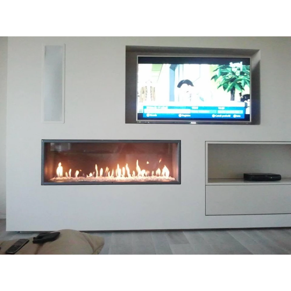Газовая топка с большим горизонтальным окном из огнепрочного стекла. Представленная топка рассчитана на использование природного газа бутан или баллонного газа пропан, что позволяет устанавливать камин не только в загородном доме, но и в городской квартире. Для такого камина не требуется заготовка дров, поддержание горения огня и постоянная чистка камина от золы. Конструкция топки изготовлена из высококачественной стали толщиной 3,5 мм.