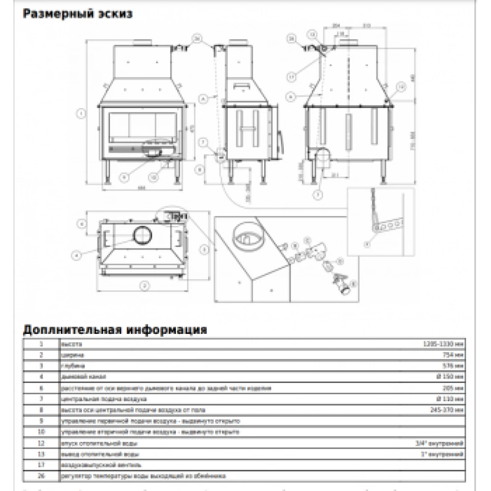 | Вид топливадрова и брикеты | Высота видимой части топки754 | КПД, %84.6 |