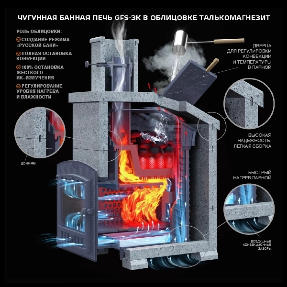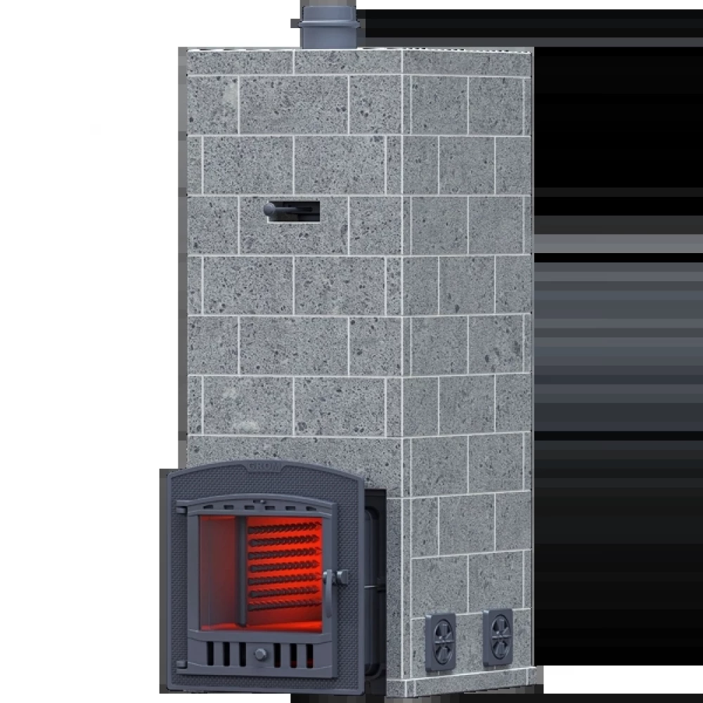 Облицовка закрывает корпус со всех сторон, имеет выходы для топливника, дымоходной трубы и подкидной дверцы.