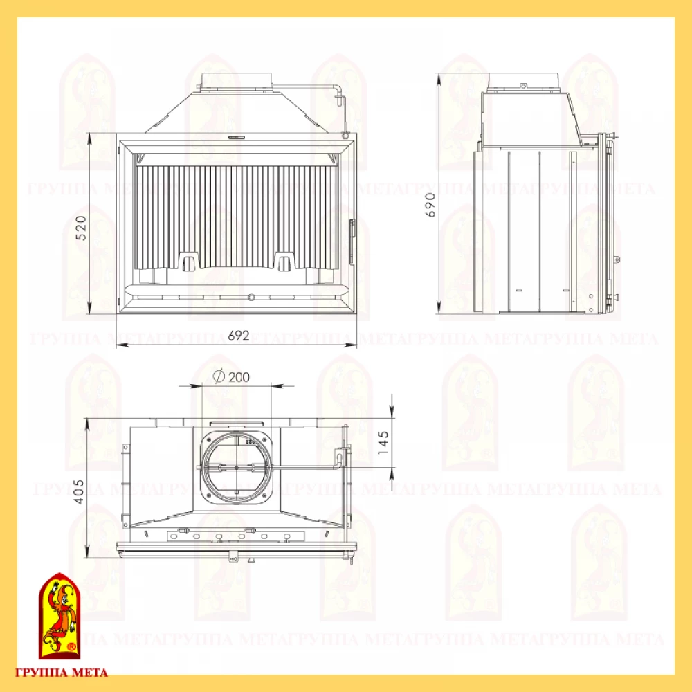| Высота690 мм | Глубина405 мм | Диаметр дымохода200 мм |