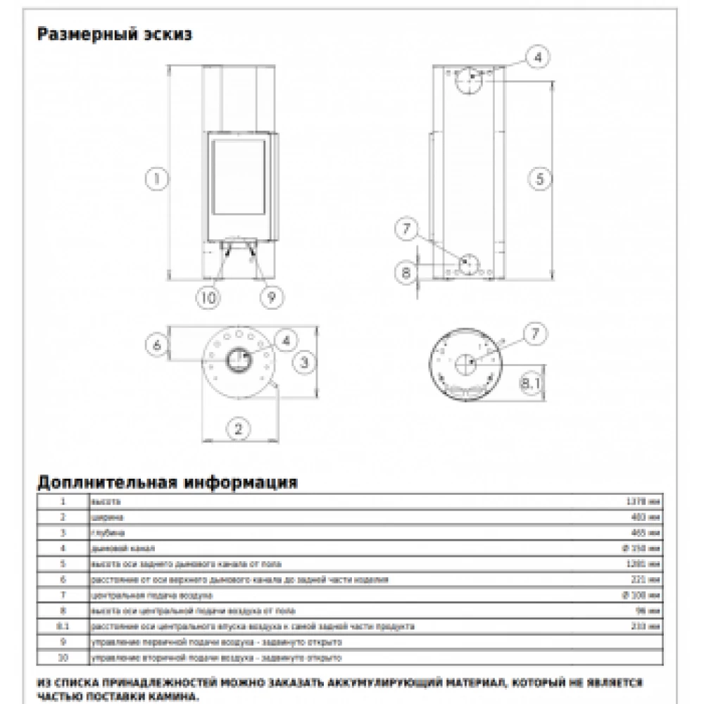 Выход дымохода возможен вверху печи и сзади, также есть возможность подвода воздуха на горение с улицы или из подвального помещения. Для увеличения теплоотдачи печи предусмотрен комплект аккумулирующих элементов (опция), которые устанавливаются сверху топки вокруг дымоходной трубы.