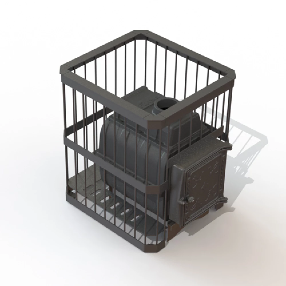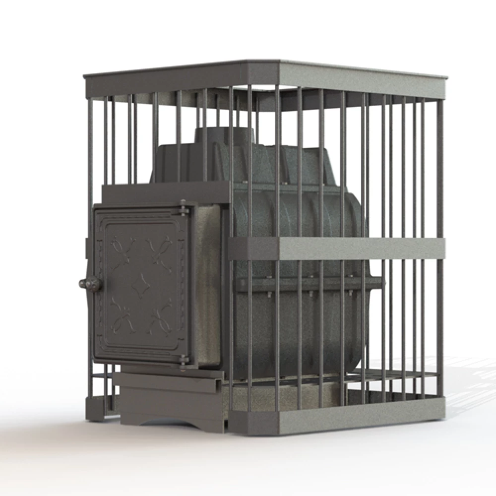 Печь предназначена для отопления парильных помещений 10-18 куб. м. Топка печи чугунная. Каменка в виде сетки из стального прутка. Топливный канал без выноса для топки печи из парильного помещения. Топочная дверца чугунная стандартная К211 Fireway, размер 290х297 mm. Загрузка дров фронтальная. Диаметр дымохода 115 мм. Расположение дымохода сверху. Отделка антрацит. Гарантия 3 года.