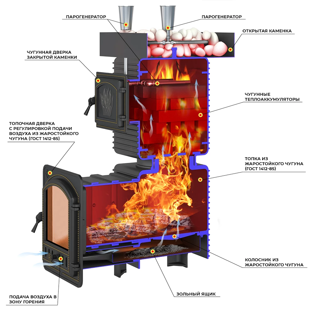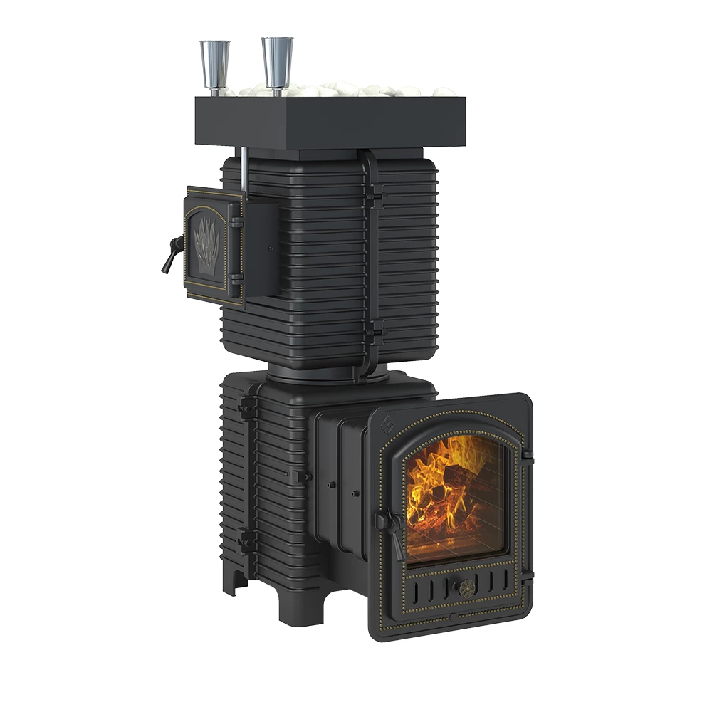 Поворотная чугунная банная печь EVEREST Лёгкий Пар ПРОФИ с каменкой по-серому предназначена для обогрева парных помещений объёмом до 44 кубических метров и получения пара при эксплуатации в частных и коммерческих банях.Печь состоит из двух модулей: топочной камеры и модуля каменки из чугуна. Наиболее термонагруженные участки печи сделаны из жаропрочного чугуна толщиной 20 мм.Для накопления теплового заряда в каменку размещают заклад из чугунных брусков (чушек) или камней для бани. При горении дров пламя напрямую нагревает заклад, что позволяет накопить достаточно энергии для получения качественного перегретого пара.Для увеличения площади теплоотдачи по всей поверхности печи устроено оребрение, за счёт которого чугун быстрее отдаёт тепло в окружающее пространство и способствует ускорению нагрева парной, каменного заклада и облицовки печи.Топочная часть и каменка при установке печи могут быть повёрнуты друг относительно друга. Это позволяет направить отверстие каменки в парилке в удобную сторону.После установки на место каменка и топка соединяются между собой при помощи герметика и термостойкого шнура.Каменка для установки заклада сверху и снизу имеет отверстия для прохода пламени и дымовых газов. Чугунные теплоаккумуляторы или камни находятся прямо в пламени. Каменка рассчитана на размещение 170-180 кг чугуна или 70-80 килограммов камня для бани, создаёт массивный тепловой заряд. Внешний корпус изготовлен из чугуна, его части крепятся друг к другу по типу «паз-гребень» с использованием термостойкого герметика.В качестве открытой каменки выше основной части печи может быть размещён стальной поддон для камней, куда умещается более 60 кг камня. Совокупный вес печи и чугунного заклада составляет более 400 кг.Подача пара в каменку производится через дверку, распложенную на одной из сторон каменки. Парогенератор открытой каменки укладывается между камнями в верхнем поддоне.Чугунная дверка артикул 290 специально разработана для этой печи, обеспечивает регулировку подачи воздуха в широких пределах и безопасность использования печи, не деформируется при длительном нагреве.Температура ,°СВлажностьВремя, t (min)Классическая русская баня45-6540-6550Горячая русская баня70-9020-3560Турецкая баня40-45ок. 10040Финская сауна90-1105-1580*Внешний вид товара может незначительно отличаться от фотографий на сайте