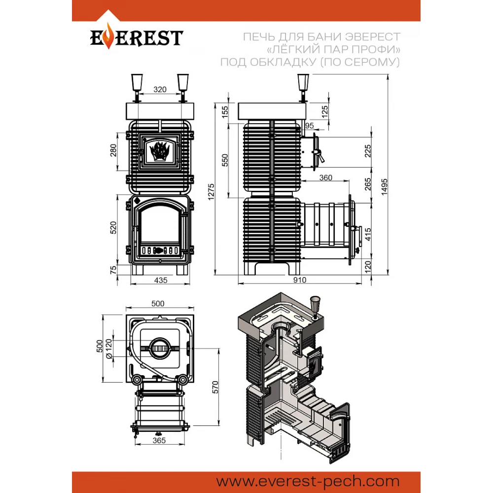 Технические характеристики Печь для бани Эверест "Легкий пар Профи" под обкладку (по-серому)