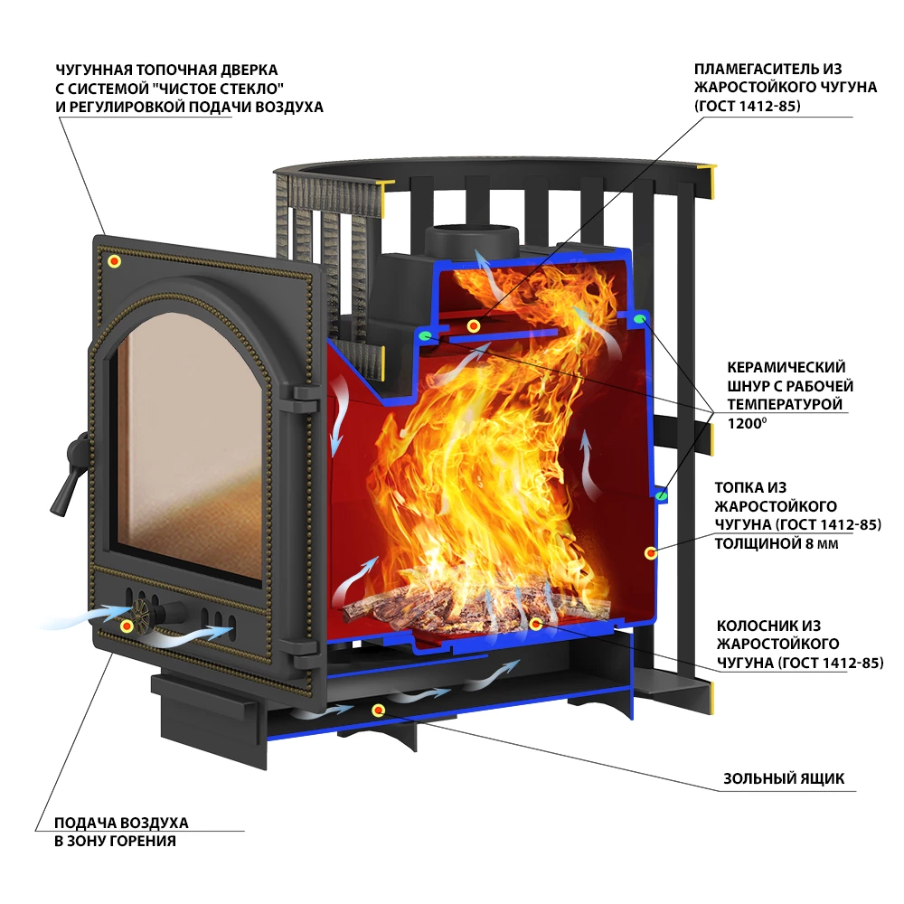 Преимущество печи в том, что топка печи состоит из 3-х элементов. На стыке между ними используется керамический шнур с рабочей температурой 1200 градусов. То есть топка печи абсолютно герметична! Для фиксации деталей между собой применяется болтовое соединение, что даёт 100% гарантию безопасности при эксплуатации.Банная чугунная печь Легенда Стандарт 16 (ДТ-4С) укомплектована чугунной не герметичной дверцей Везувий ДТ-4. Конвекционно-вентилируемый кожух "Стандарт" изготовлен из металлического прутка диаметром 6мм покрашенной черной термостойкой краской.