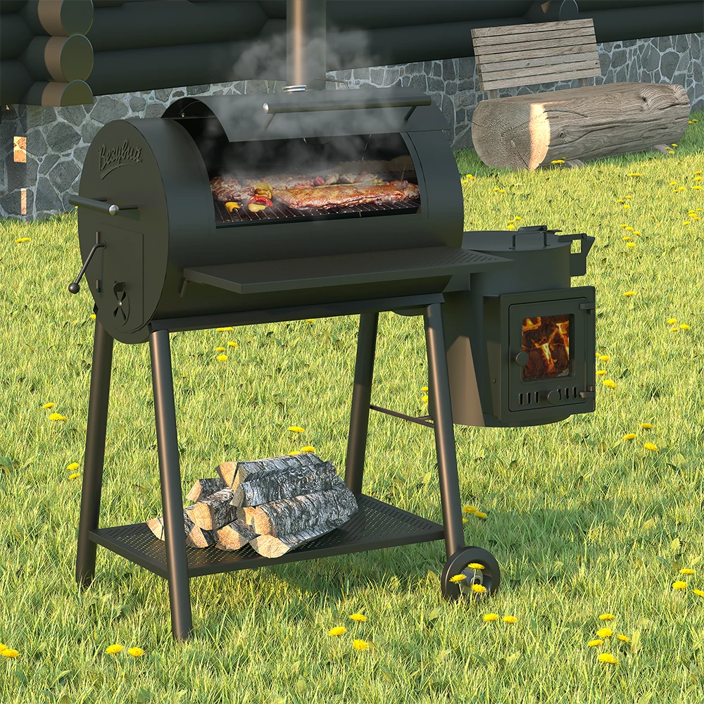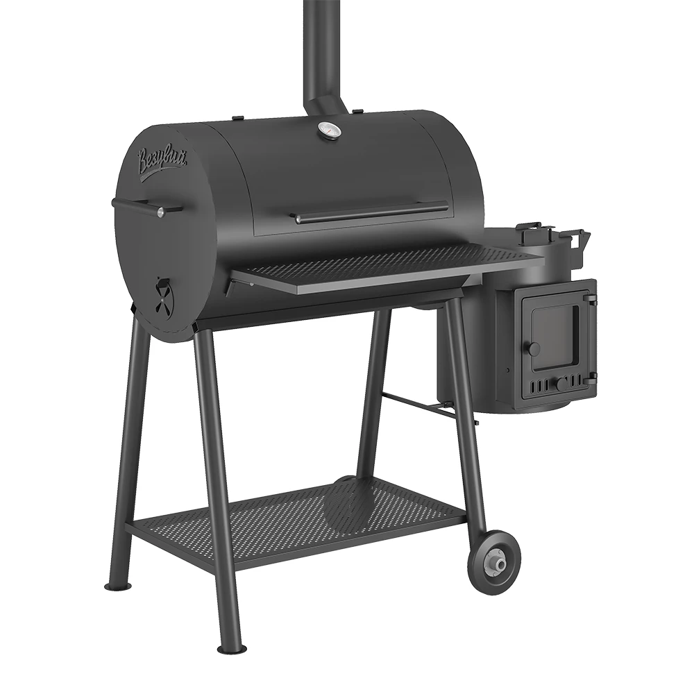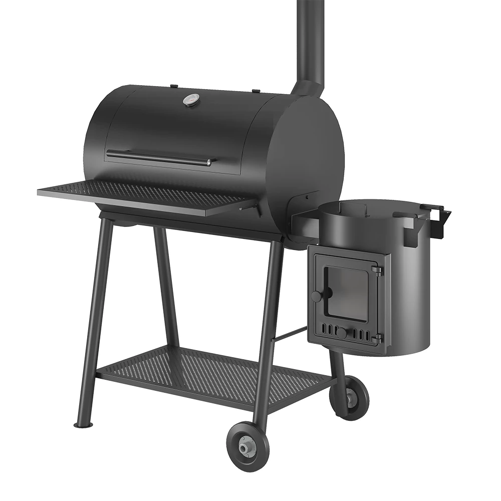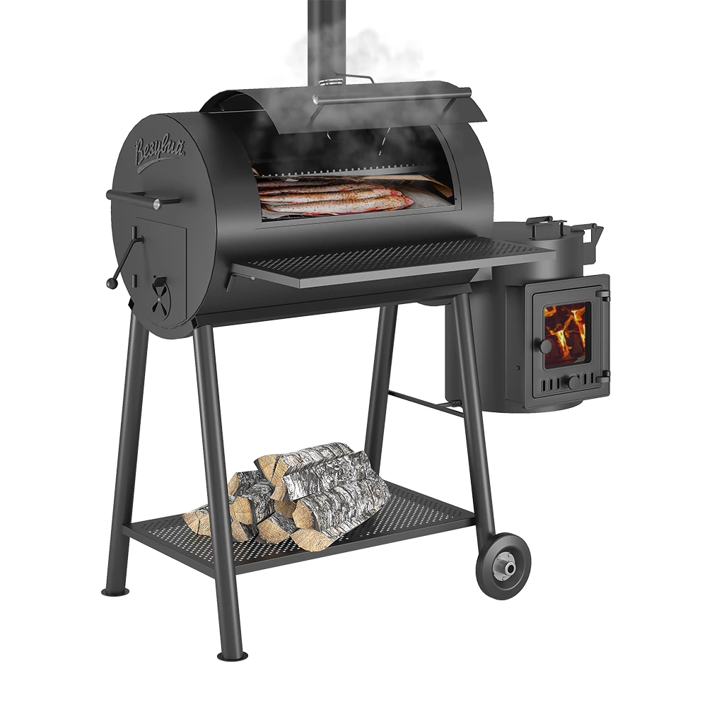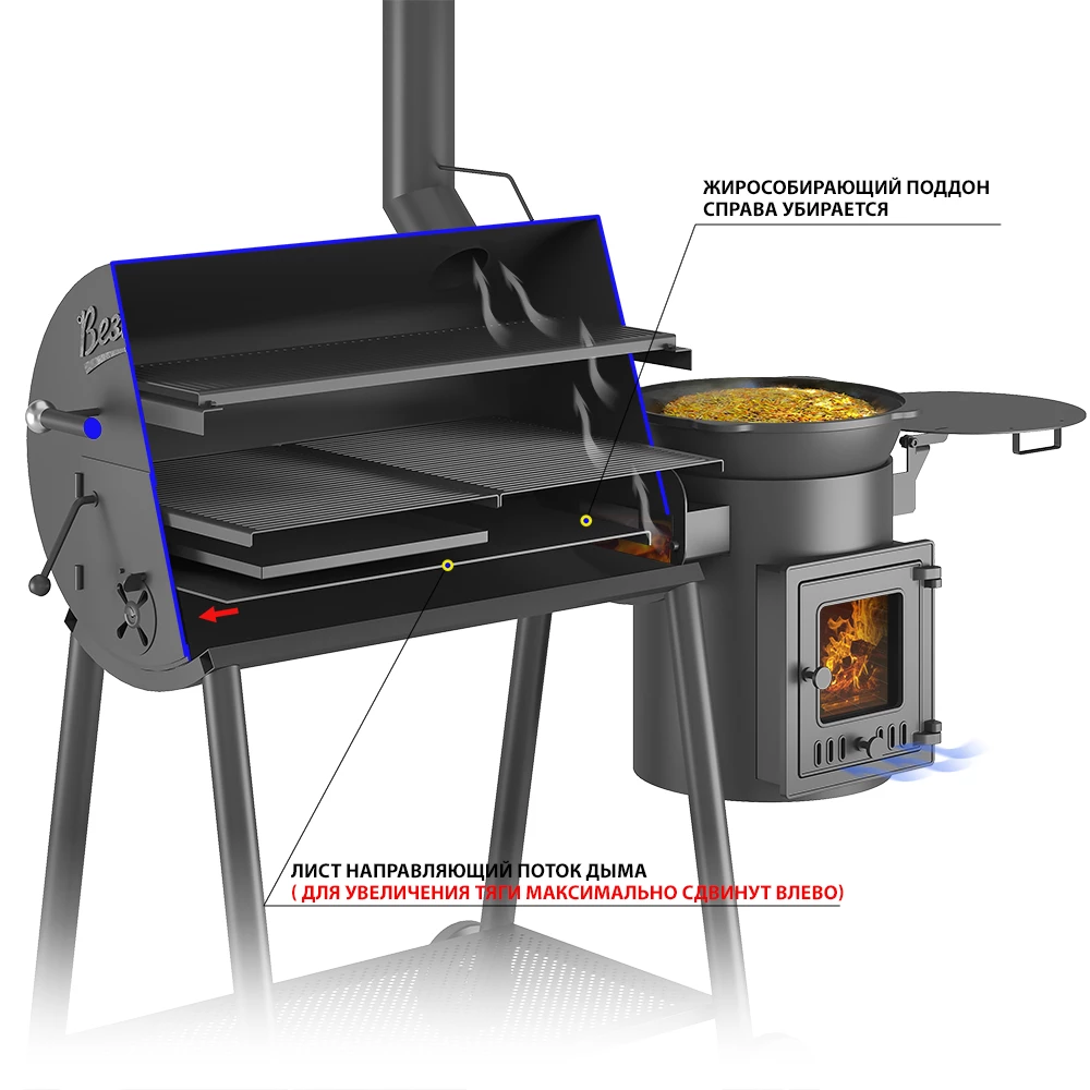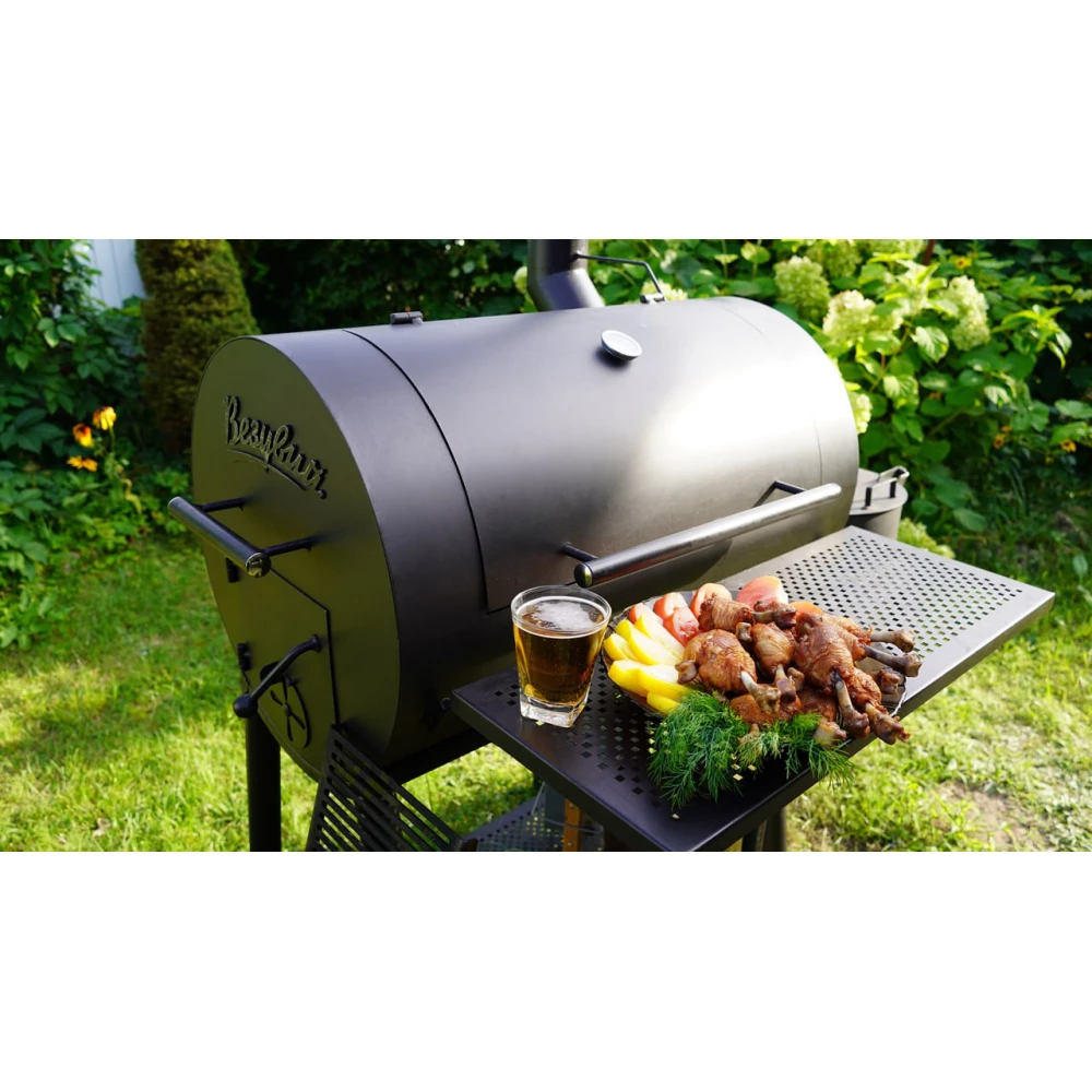 Смокер Кудесник — приспособление для приготовления пищи на открытом огне, сочетающее в своей конструкции барбекю, печь под казан и коптильню.Основной модуль Кудесника цилиндрической формы, оснащён крышкой. В этом модуле размещены стальные поддоны для размещения угля. Выше поддонов расположены стальные решётки, на которые при приготовлении укладываются подготовленные продукты.Зола собирается в стальной поддон, уложенный на дно смокера. Основной модуль предназначен для использования в качестве мангала или барбекю, а также может быть использован в качестве коптильни для высокотемпературного копчения. Топливо размещается на поддонах из стали, продукты укладываются на решётки, где и происходит их приготовление.Малый дополнительный модуль смокера изготовлен в виде печи под казан и может быть использован в качестве топливного отсека для малотемпературного копчения продуктов.При копчении сюда закладывается топливо (древесный уголь, угольные брикеты) и щепа для копчения. При нагреве и дымлении щепы дым проходит через боковое отверстие в основной модуль смокера, попадая на продукты. Дополнительный модуль оснащён чугунным колосником и зольным ящиком для сбора золы.Дополнительный модуль съёмный, крепится к основной части смокера на болтах. Модуль оснащён дверкой со стеклом для контроля горения и состояния дров и закладываемой щепы.В модуль устанавливается казан Везувий объёмом 6 или 8 литров. При приготовлении пищи в казане крышка печи выполняет функцию откидного столика.Для удобного использования на передней поверхности смокера сделана съёмная стальная полка для размещения продуктов и посуды. Смокер установлен на подставке с надёжными стальными ножками. В нижней части подставки сделана полка, на которой удобно хранить дрова и инструменты для работы со смокером. Две ножки смокера оснащены колёсами для удобства перемещения изделия по зоне барбекю. Для перекатывания смокера используется ручка на боковой стороне основного модуля смокера.*Внешний вид товара может незначительно отличаться от фотографий на сайте