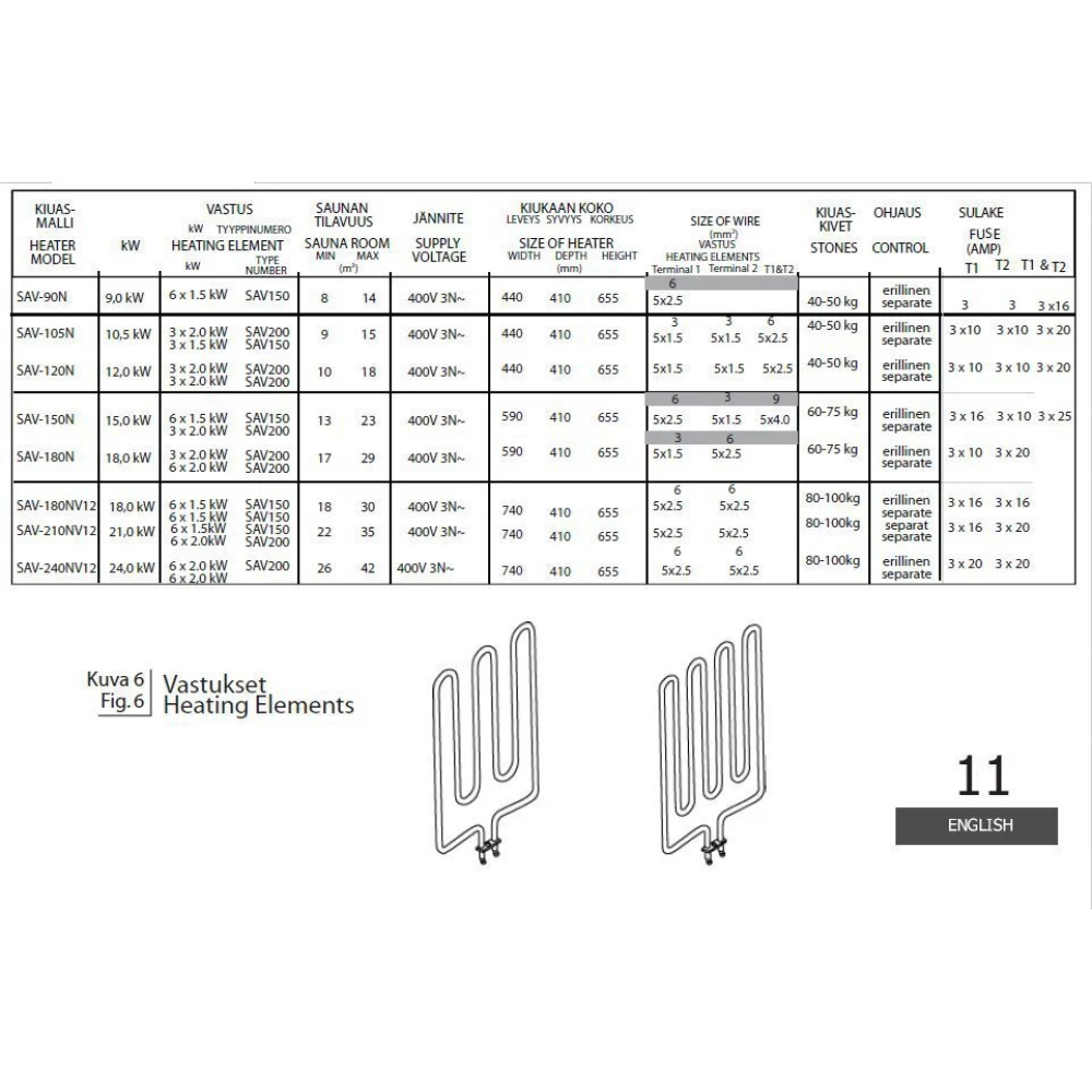 Технические характеристики ТЭН SAWO HP03-003 SAV 200 (для Savonia 105N, 150N, 120N, 180N, 210NV12, 240NV12)