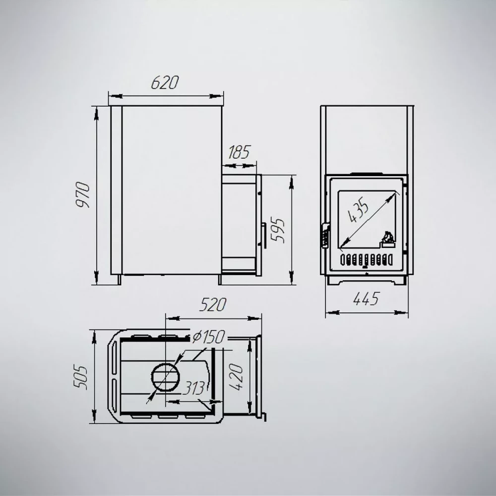 | Вынос топочной камеры190 | Диаметр дымохода135 мм | Масса закладываемых камней60 - 80 кг |